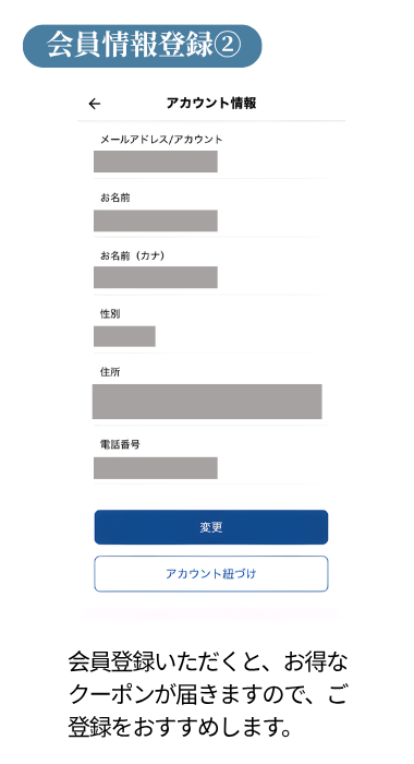 アカウント情報から氏名・性別・住所・生年月日等の情報が登録できます。