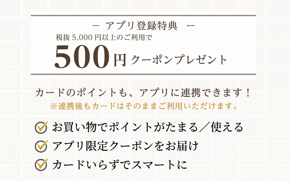 アプリでは、お買い物で貯まるポイントの確認やご使用、各種お知らせの受け取りなどがより便利になります。
